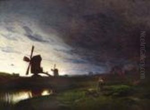 Winter Abend - A Frozen Winter Landscape, A Woman Carrying Faggots, Distant View To A Town Beyond