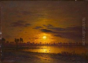 A Tropical Landscape With The Sun Setting Over A Lake And Figures On A Hilltop