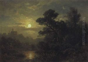 Mondscheinlandschaft Mit Einer Ortschaft Am Hang Uber Dem Flusschen Links