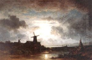 Hollandische Landschaft Mit Windmuhlen Bei Einem Wasser Bei Sonnenuntergangsstimmung
