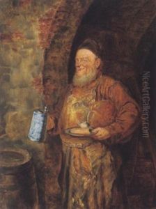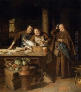 Interior Scene Of Monks, One Wearing A Green Apron And Holding A Flagon And A Cask