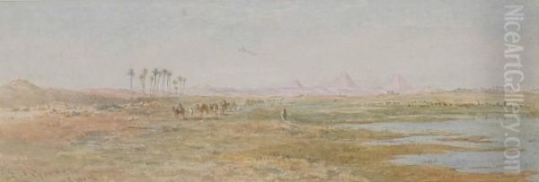 A Camel Train On The Banks Of The Nile, The Pyramids Beyond
