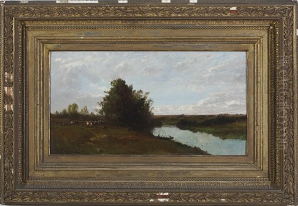 Summer Lanscape With Stream And Cows