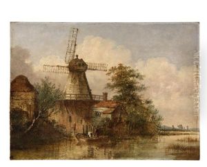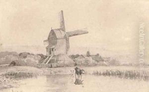 A Country Scene With Figures By A Pond And A Windmill In The Distance