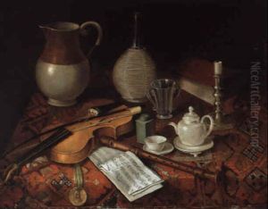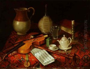 A Still Life Of A Violin, A Quill And Inkwell, A Porcelain Bowl, A Recorder, A Silver Kettle And Various Musical Manuscripts On A Table