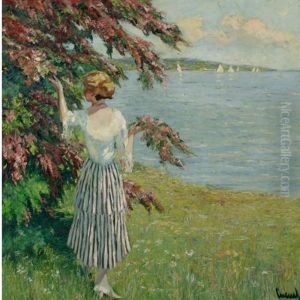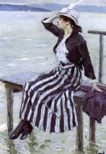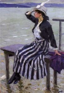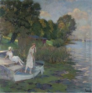 Zwei Damen Am Seeufer, Segelboote Betrachtend