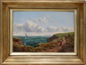 View Across A Bay, A Figure On A Path In The Foreground, Shipping And A Tower Beyond