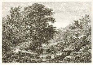 Travellers on a sandy track in a rocky river landscape