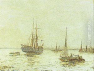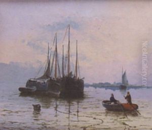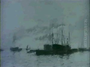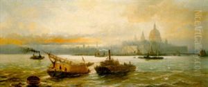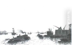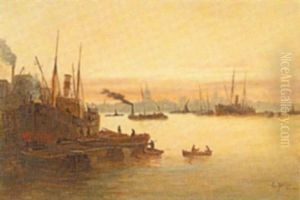 Coal Barges By A Coastal Steamer At A Wharf (+ Haybarge And Steamer Moored In An Estuary, Possibly The Thames Or Medway; Pair)
