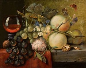 Still Life With Grapes, Peaches, Raspberries, Hazlenuts And Walnuts On A Stone Ledge (+ Still Life With A Wine Galss, Grapes, Peaches, Plums And A Peacock Butterfly On A Stone Ledge; 2 Works)