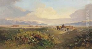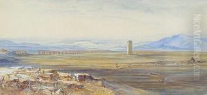 A View Of The Roman Campagna With Travellers Passing A Ruined Brick Tomb, An Aqueduct In The Distance