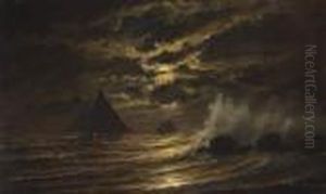 Square-rigged Shipping Vessel Sailing By Moonlight Oil On Canvas