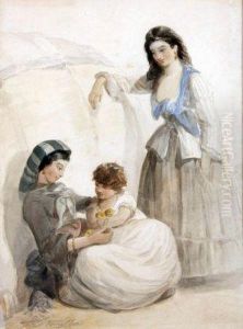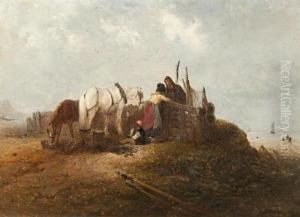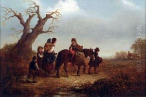 A Family Returning From Market, With Pond And Houses Beyond