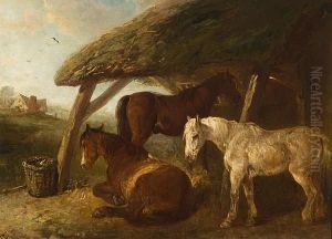 Horses Watering Before A Thatched Cottage