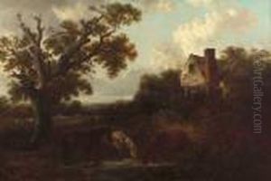 Anglian Landscape With Figure And Dog By A Lock