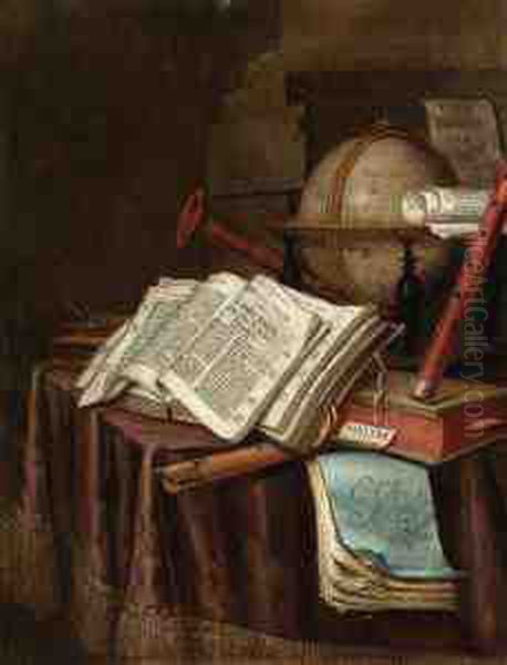 A Vanitas Still Life With A Globe, Musical Instruments, A Score Andan Emblem Book On A Draped Table Before A Column