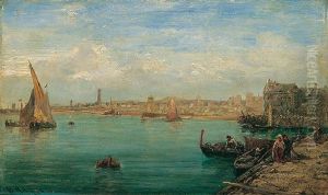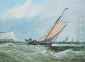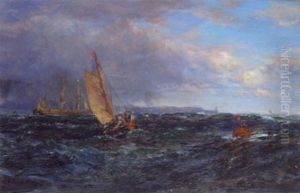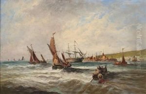 A Coastal Scene With Shipping And Figures In A Dinghy Hauling In Nets