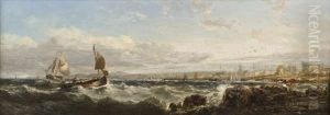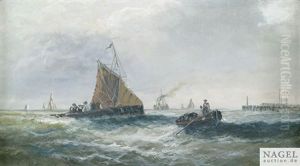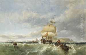 A Coastal Scene With Shipping And Figures In A Dinghy Hauling In Nets