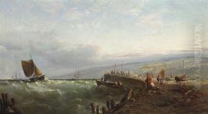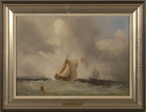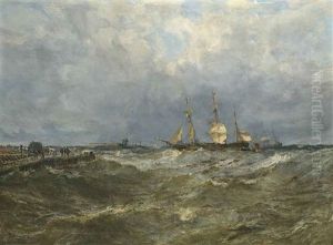 Sailing Ships In A Squally Sea By The Coast With Figures Watching