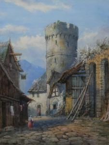 Figures On Shore Of Continental Lake And Fortified Town
