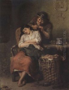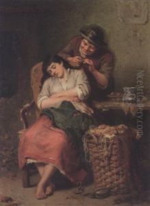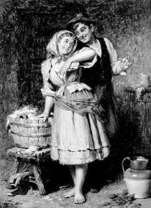 Et Kaerestepar, En Ung Mand Betragter En Ung Pige, Der Vasker Toj