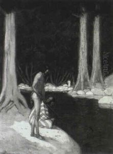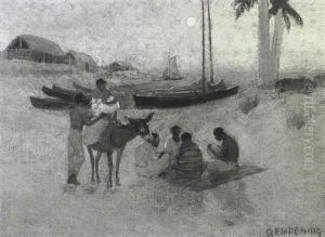 Moonlight Scene With Three Indians And A Canoe