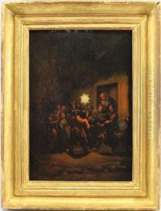 A Nocturnal Village Scene On The Oude Delft, With Numerous Figures Gathered Around A Burning Tar-barrel