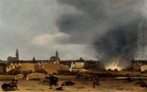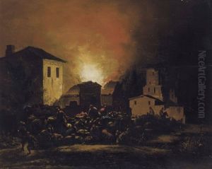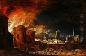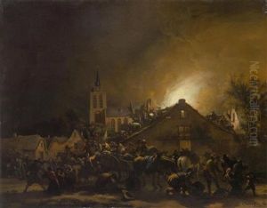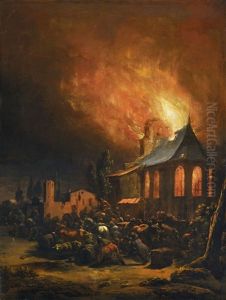 Fire In A Village At Night With Numerous Figures Near A Bell Tower On The River Bank