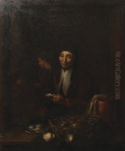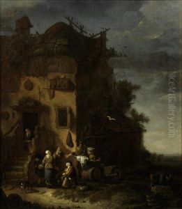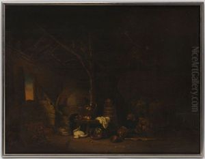 A Barn Interior With A Maid Milking Cattle, And A Peasant