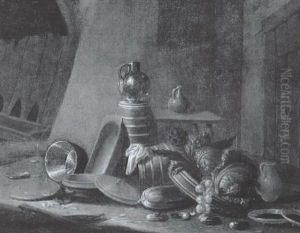 Still Life Of A Broom, Carrots, Turnips, Jugs And Pewter Vessels In A Courtyard, With A Man Peering Through A Window Beyond