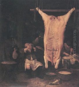 An Interior With A Still Life Of Kitchen Utensils, A Cat, Caged Rabbits And A Maid Plucking A Chicken
