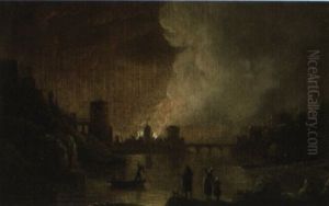 Villagers Collecting Water By Moonlight From A River To Dowse A Fire Blazing In A Windmill At The Edge Of A Town