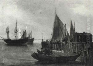 A Fisherman Working On His Boat Moored To A Quay Where Other Figures Stroll And Fish
