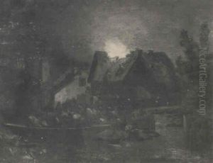 A Townhouse Ablaze At Night With Peasants Fighting A Fire