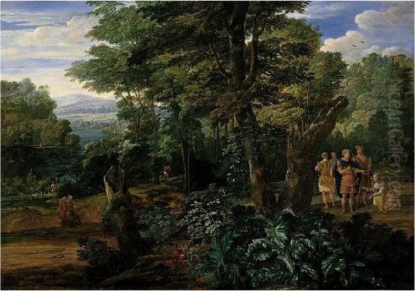 A Wooded River Landscape With Semiramis Receiving The Crown Of The King Of Assyria
