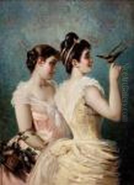 "zwei Madchenmit Vogel Und Blumenkorb"