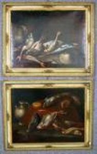 Coppia Di Nature Morte Raffiguranti Pesci, Crostacei E Funghi, Olio Su Tela