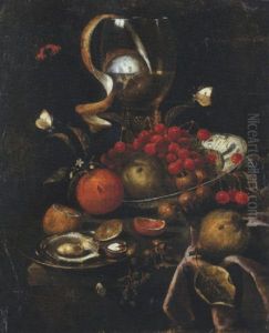 An Oyster, Grapes, A Partly- Peeled Lemon, An Orange And Flowers, On A Partially Draped Stone Ledge