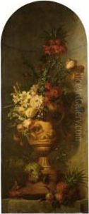 Parrot Tulips, Poppies, Roses, Morning Glory, Narcissi And Other Flowers In A Glass Vase, With Acorns And A Snail On A Stone Ledge