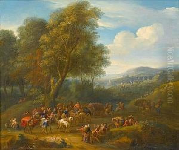 Travellers Merrymaking Outside A Country Inn, A Riverside Town Beyond; And Travellers On A Country Path, A Mountainous Landscape Beyond