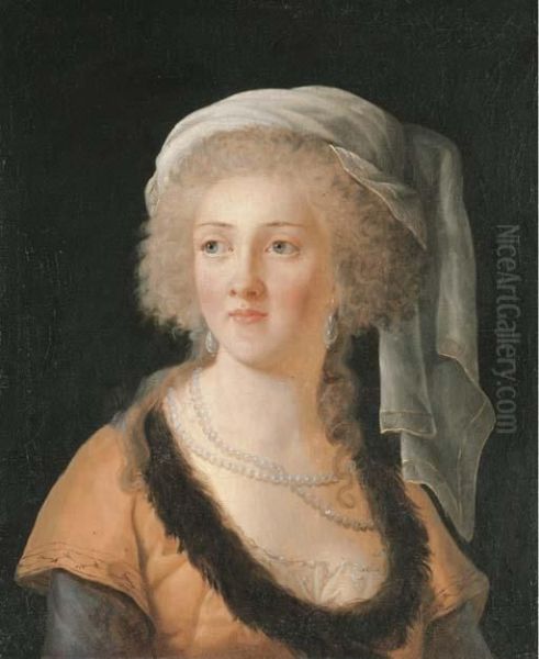 Portrait Of A Lady, Bust-length, In A Fur-lined Orange Dress, With A Pearl Necklace And A White Turban