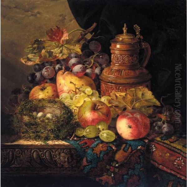 Still Life Of A Bird's Nest And Fruit