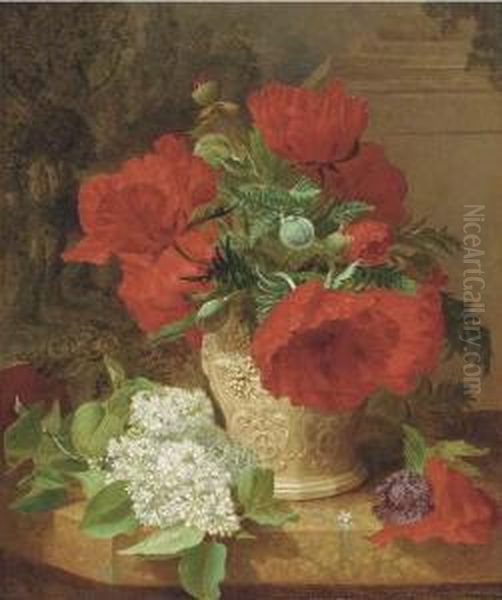 Poppies In A Vase, With White Lilac On A Marble Ledge