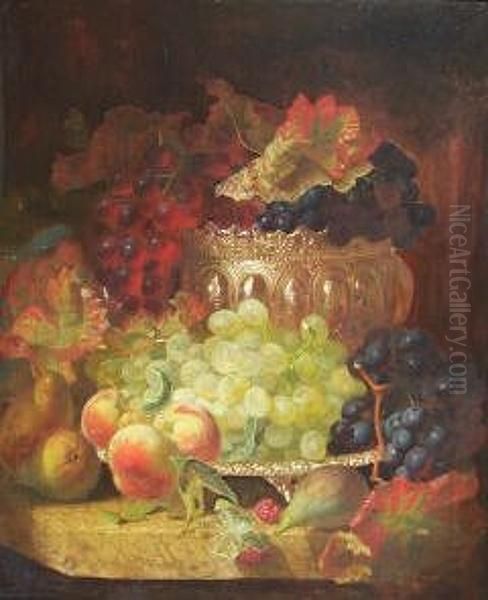 Still Life Of Fruit In A Silver Bowl And A Silver Tray All On A Marble Ledge
