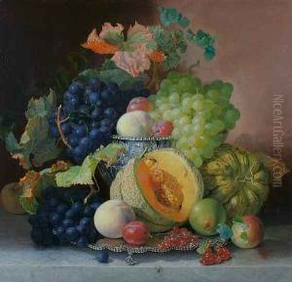 Still Life Of Grapes, Melon, Pears Plums And Peaches In A Silver Bowl