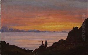 Sunset With Greenlandic Children Overlooking The Sea