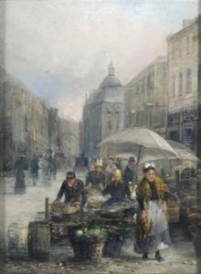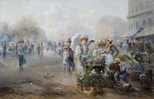 Blumenmarkt In Einer Breiten Grossstadtstrasse Mit Kutschen, Passanten Und Einer Jungen Dame Am Blumenstand