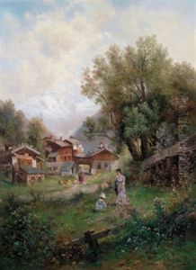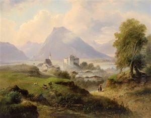 Gebirgslandschaft Mit Bauernhausern Und Figurlicher Staffage