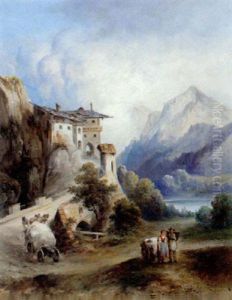 Gebirgslandschaft Mit Bauernhausern Und Figurlicher Staffage