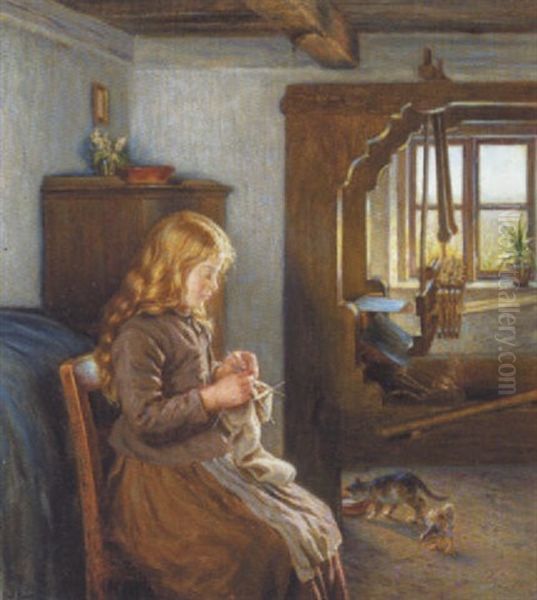 Strikkende Pige I En Bondestue